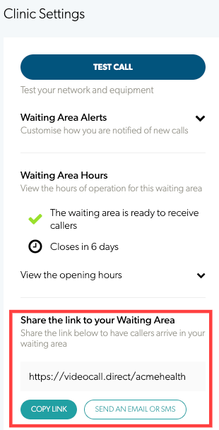 | If you do not have a button configured on your website you can Share the link to your Waiting Area, using the link found in the RHS column in your waiting area. Click on Copy Link to allow for easy copying and pasting into an email message or other communication. Or send quickly via SMS or Email. |