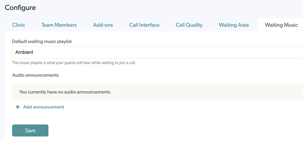 | From the dropdown menu under Default waiting music playlist, select the desired genre for your waiting patients to listen to while they wait for their consultation to begin. Click Save to save your selection. |